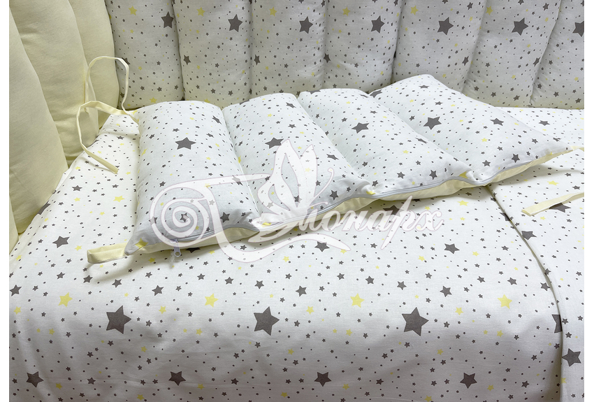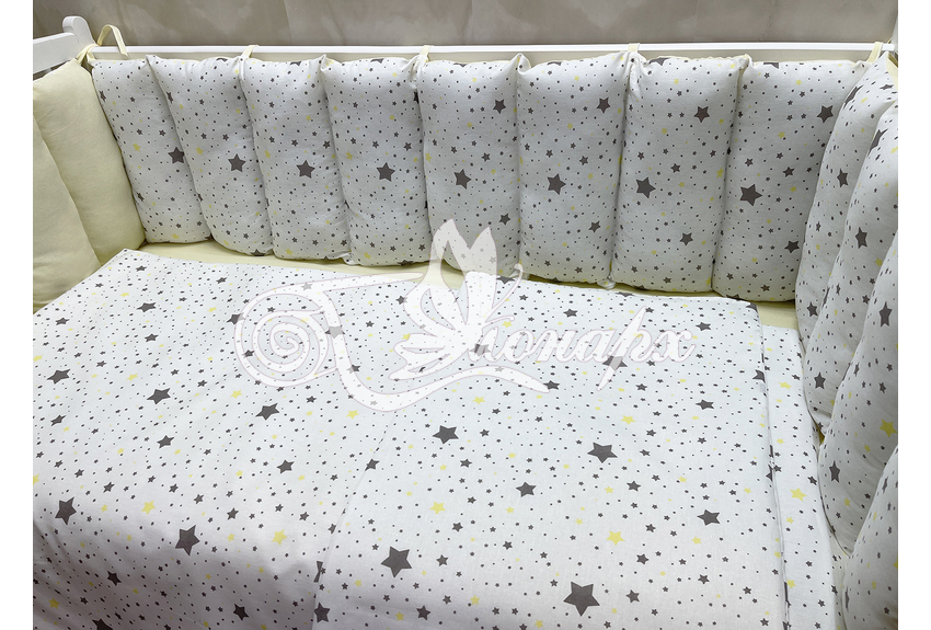 • Бортик-заборчик стеганый с синтепоном, плотно забит синтепухом (на замочках): - 2 шт. 60х34 см / - 2 шт. 120х34 см.
