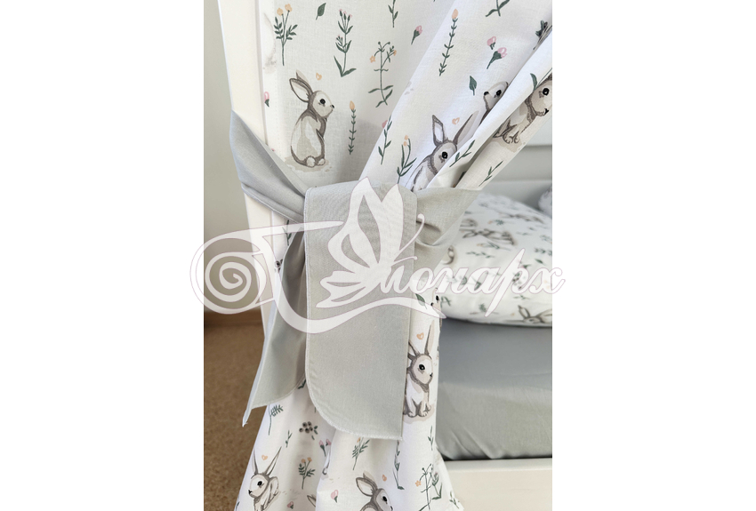 ширина - 137 см + 24 см на рюши (по 12 см на одну сторону). - Занавески с завязками (по 4 завязки на каждой занавеске) на переднюю сторону кроватки 2 шт.: