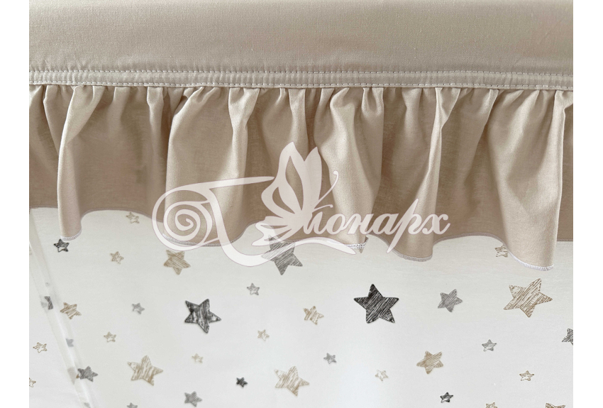 ширина - 137 см + 24 см на рюши (по 12 см на одну сторону). - Занавески с завязками (по 4 завязки на каждой занавеске) на переднюю сторону кроватки 2 шт.: