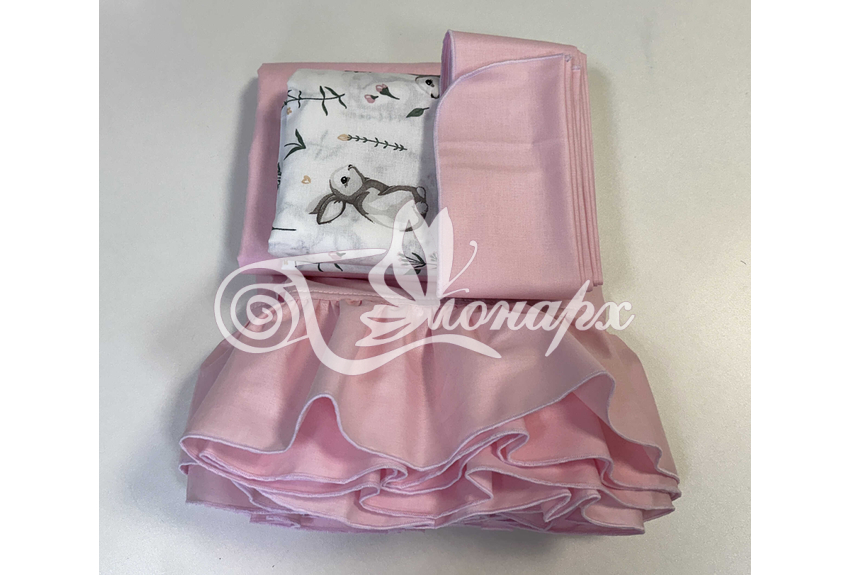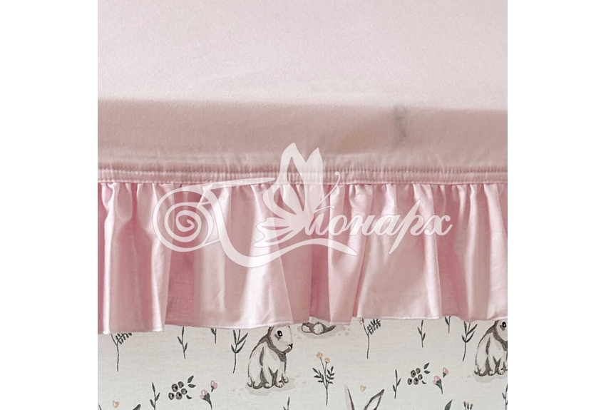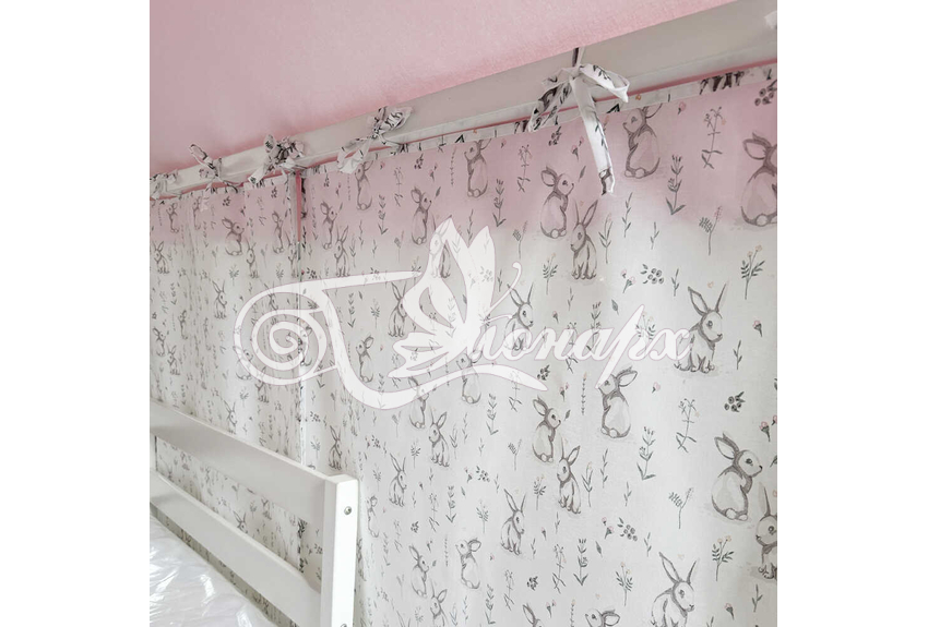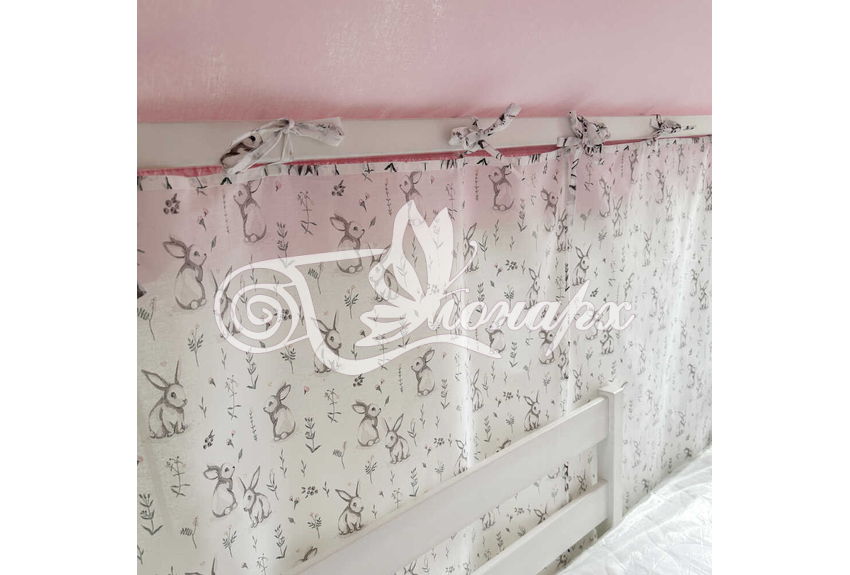 ширина - 137 см + 24 см на рюши (по 12 см на одну сторону). - Занавески с завязками (по 4 завязки на каждой занавеске) на переднюю сторону кроватки 2 шт.: