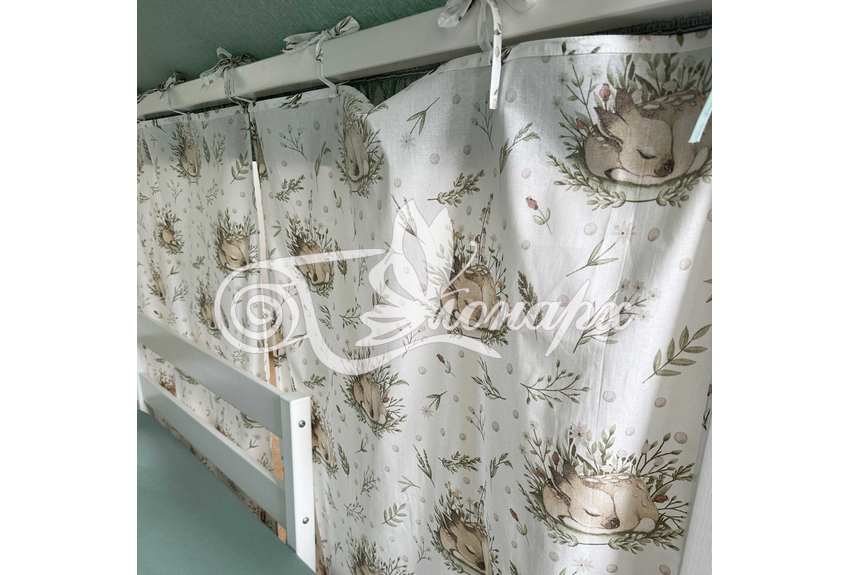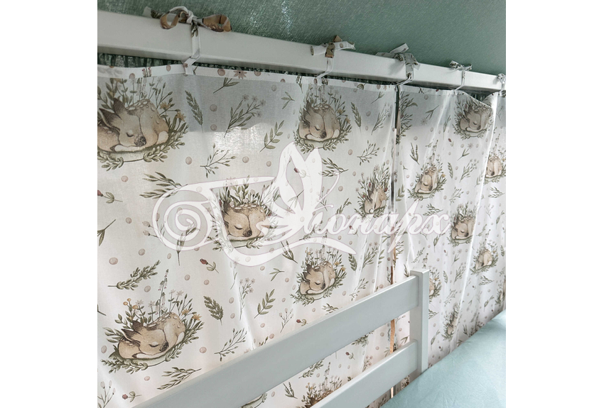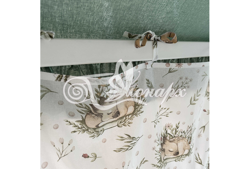 ширина - 137 см + 24 см на рюши (по 12 см на одну сторону). - Занавески с завязками (по 4 завязки на каждой занавеске) на переднюю сторону кроватки 2 шт.: