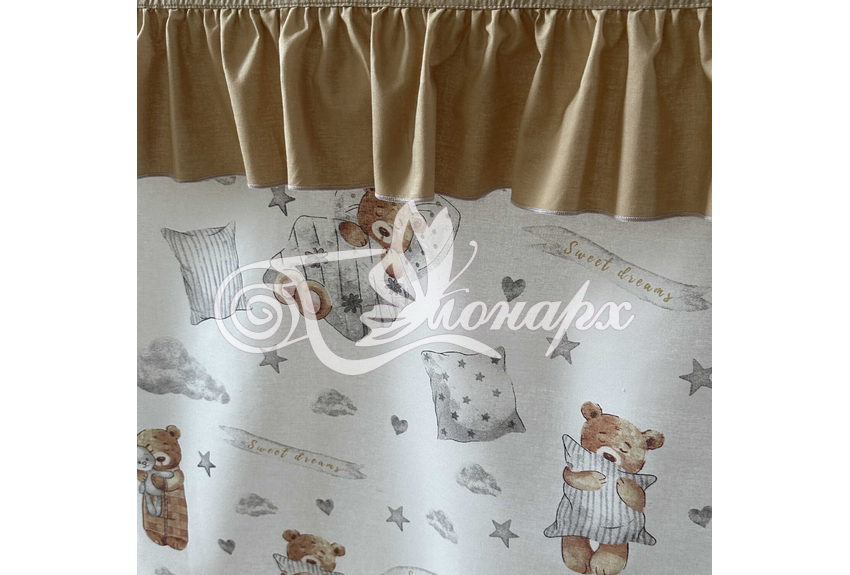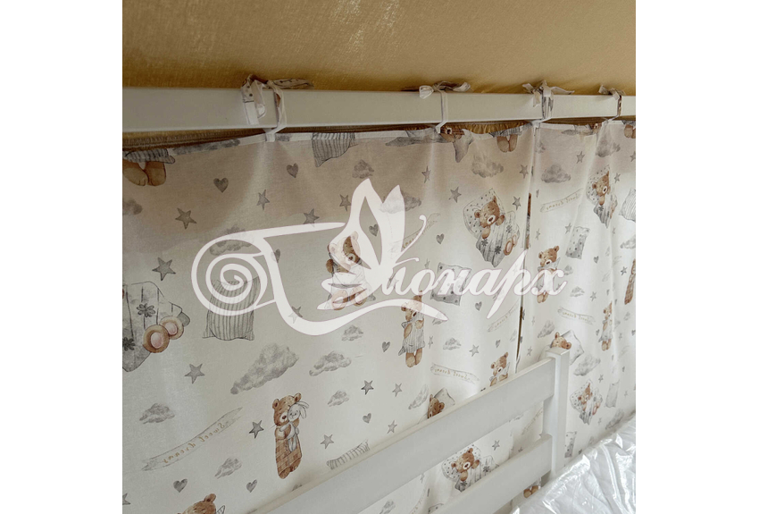 ширина - 137 см + 24 см на рюши (по 12 см на одну сторону). - Занавески с завязками (по 4 завязки на каждой занавеске) на переднюю сторону кроватки 2 шт.: